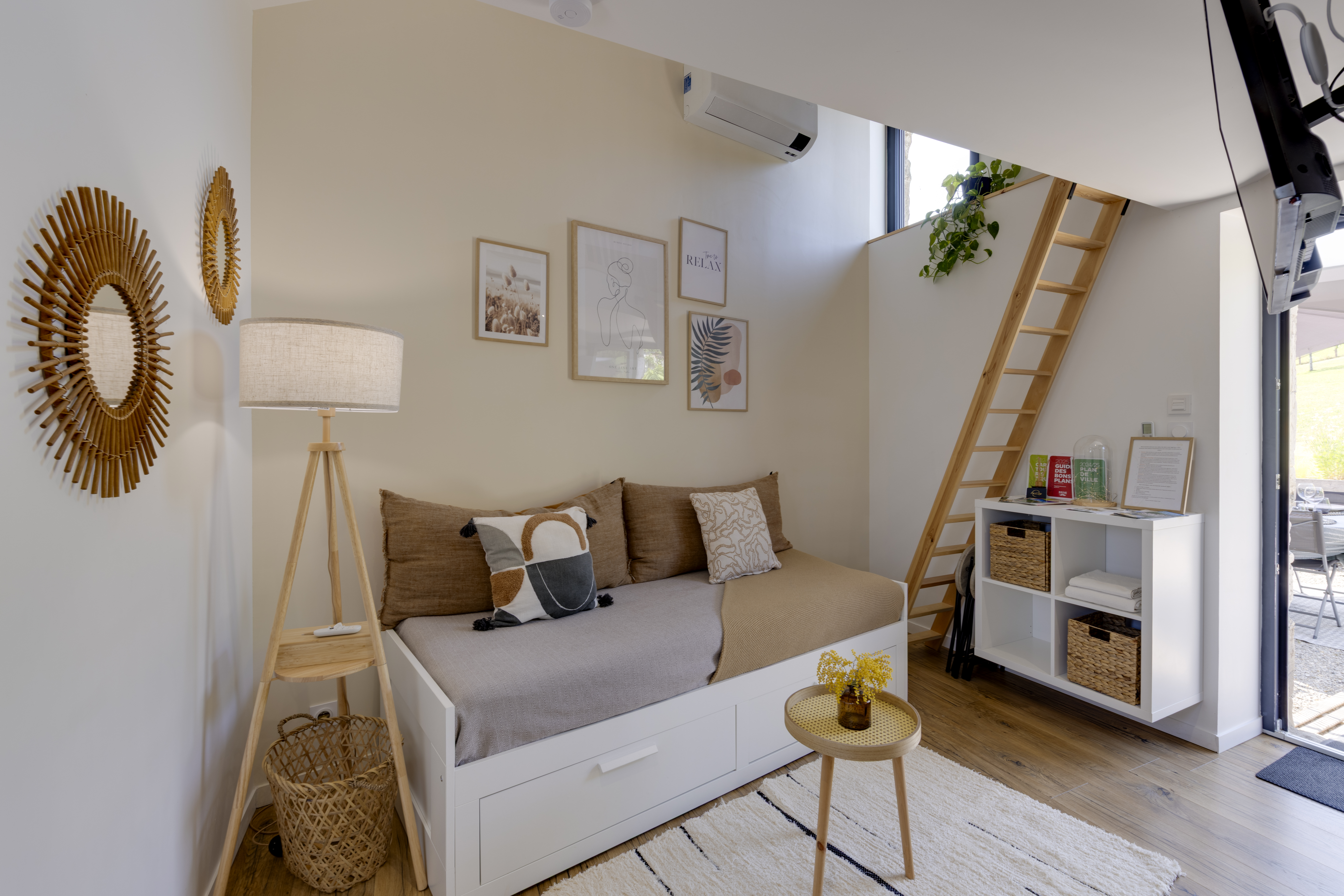 Le salon est aménagé avec un canapé-lit gigogne, facile à utiliser et offrant un couchage d’appoint confortable. Les familles et les amis de passage l’apprécient particulièrement, car il permet d’adapter l’espace à chaque situation tout en conservant une ambiance accueillante.
