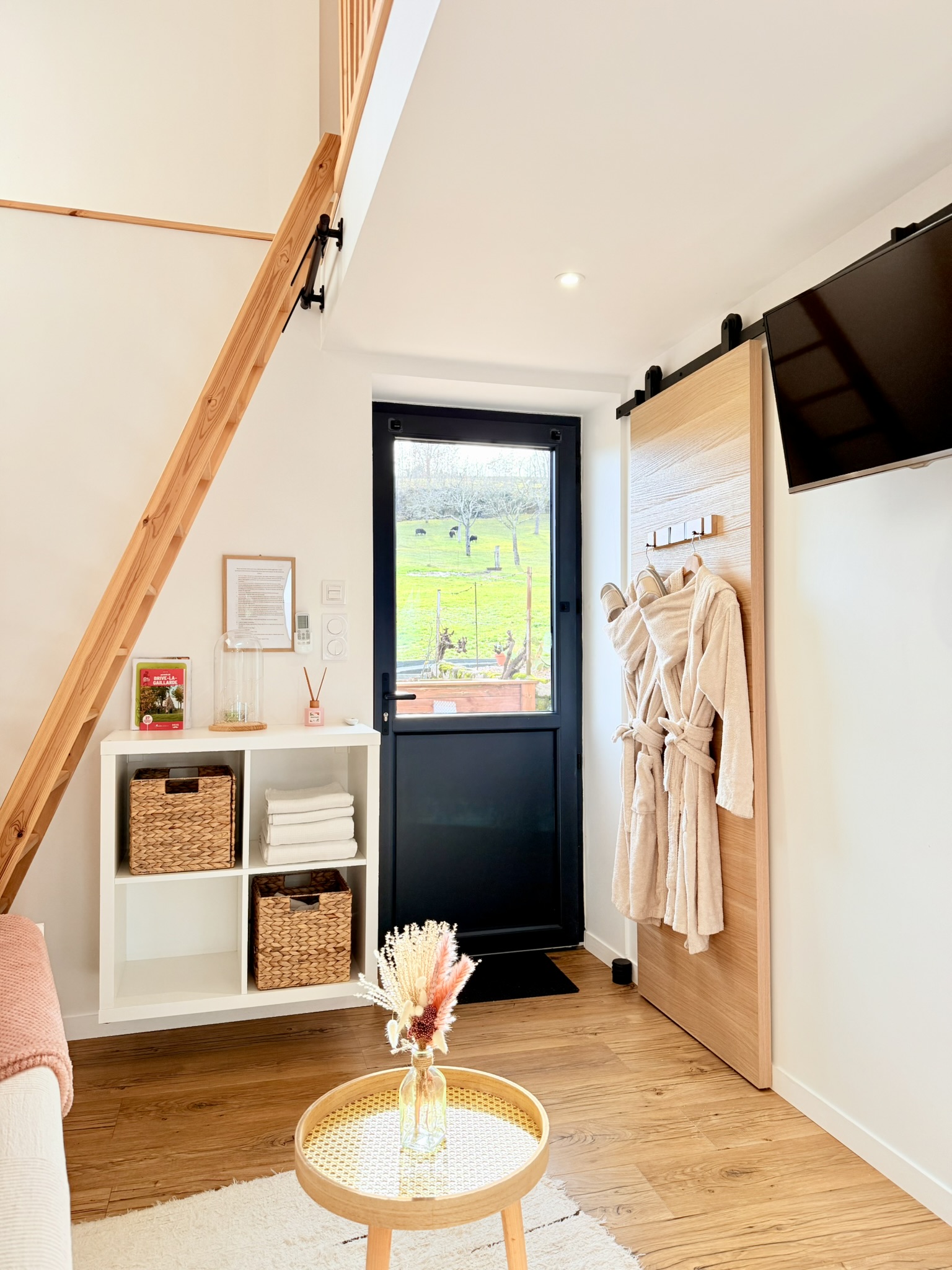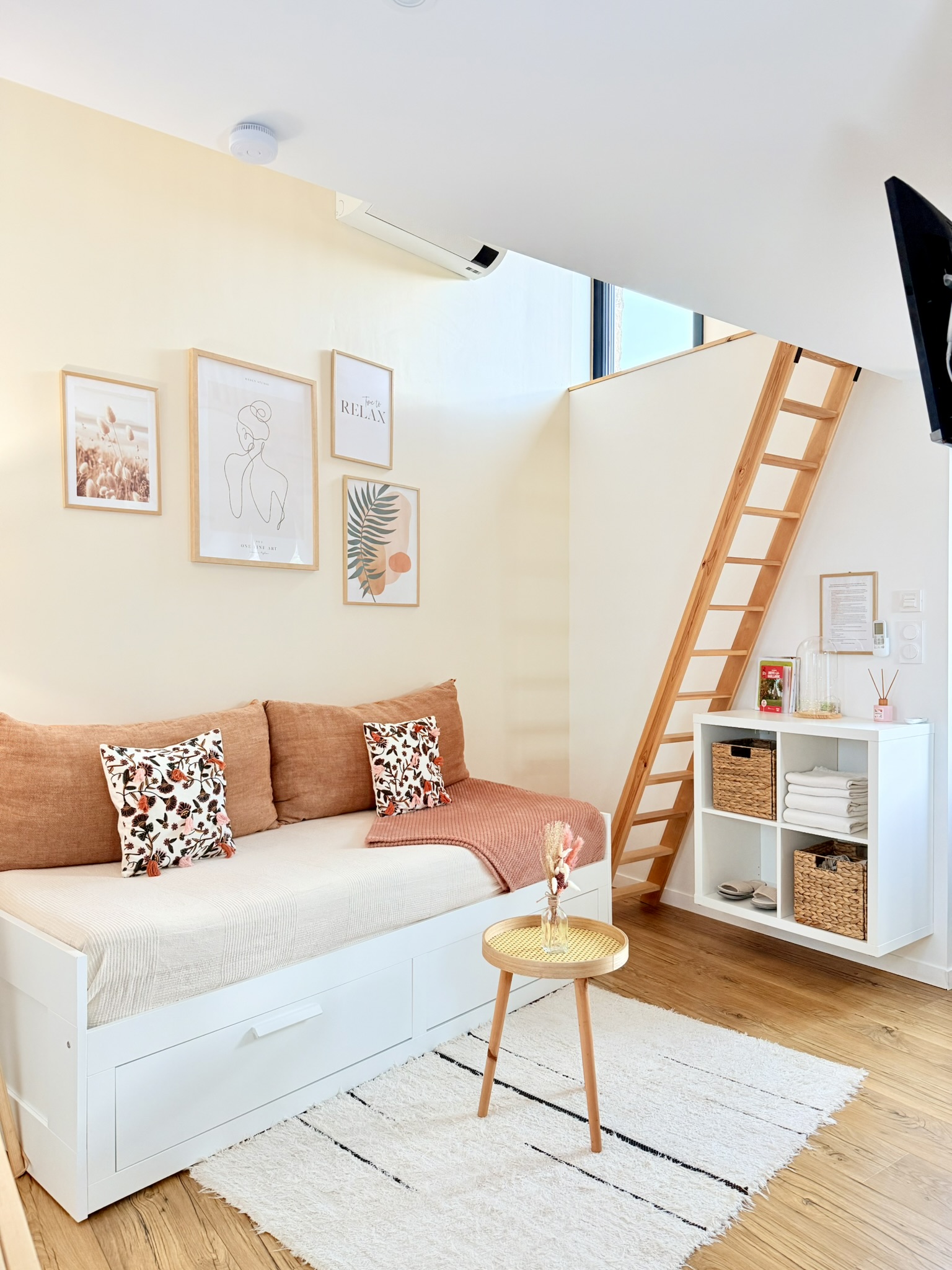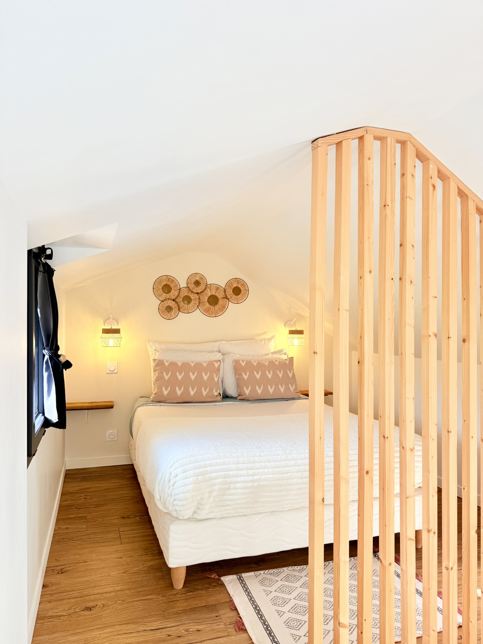Son atmosphère calme et sa décoration douce créent immédiatement une sensation de bien-être, renforcée par le spa privatif accessible 24h/24, idéal pour se détendre à tout moment.